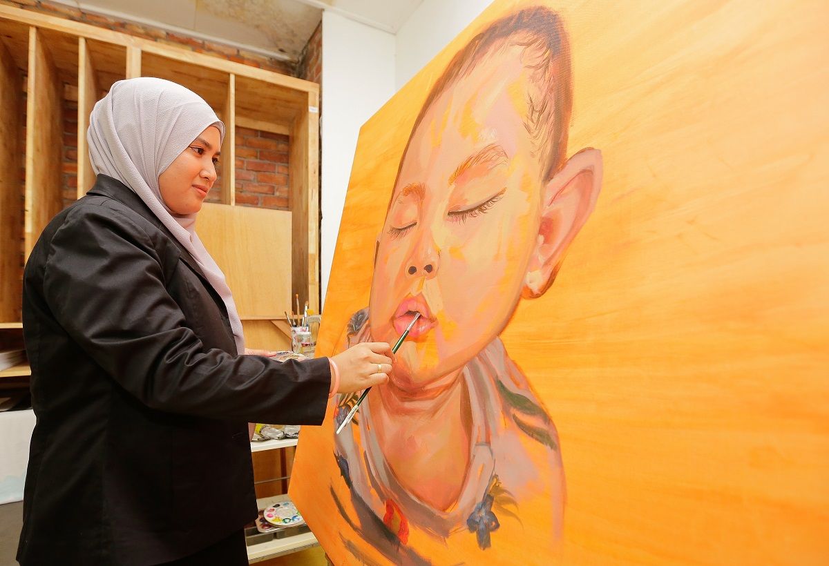 Pelukis dari Rumah Seni Selangor (RUSsELL), Anasuha Suhairi 27, melakukan proses terakhir dalam menyiapkan karya beliau | HAFIZ OTHMAN
