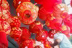 Pekerja kedai serbaneka Fun N Cheer di Shah Alam menggantung tanglung untuk dijual sempena Tahun Baharu Cina yang akan disambut pada Jumaat.