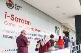Orang ramai beratur menunggu giliran untuk berurusan di bangunan Kumpulan Wang Simpanan Pekerja (KWSP), Shah Alam pada 10 Februari 2021.
