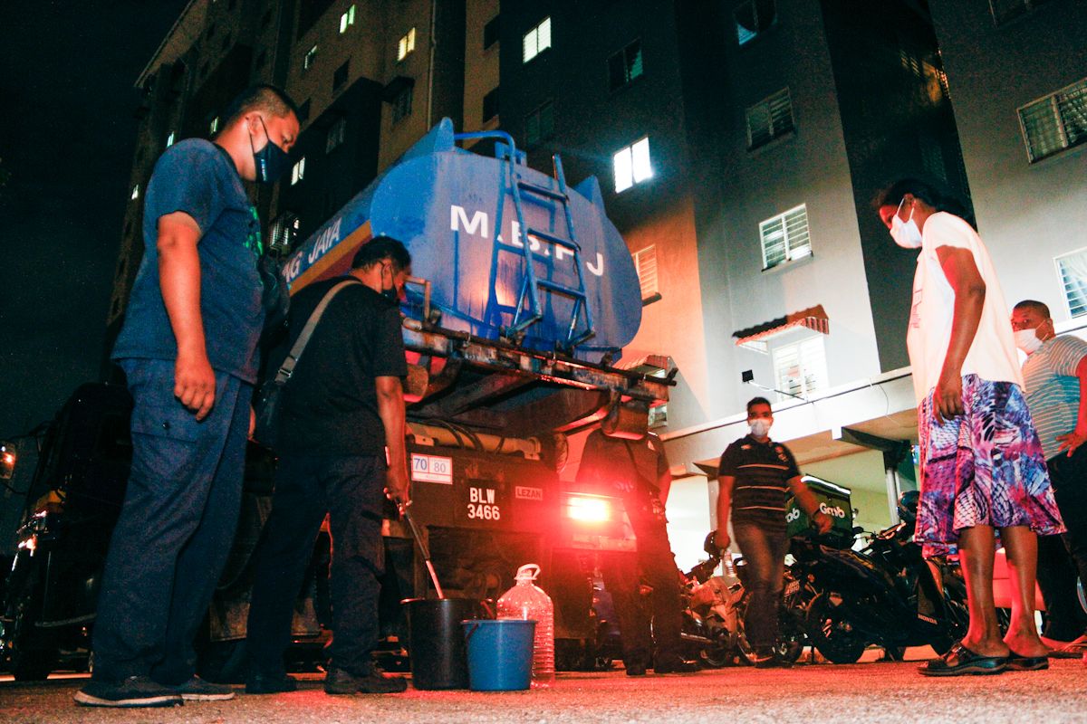 Penguat kuasa Majlis Bandaraya Petaling Jaya (MBPJ) mengagihkan bekalan air kepada penduduk Pangsapuri Lembah Subang 2, Petaling Jaya pada 24 Februari 2021.