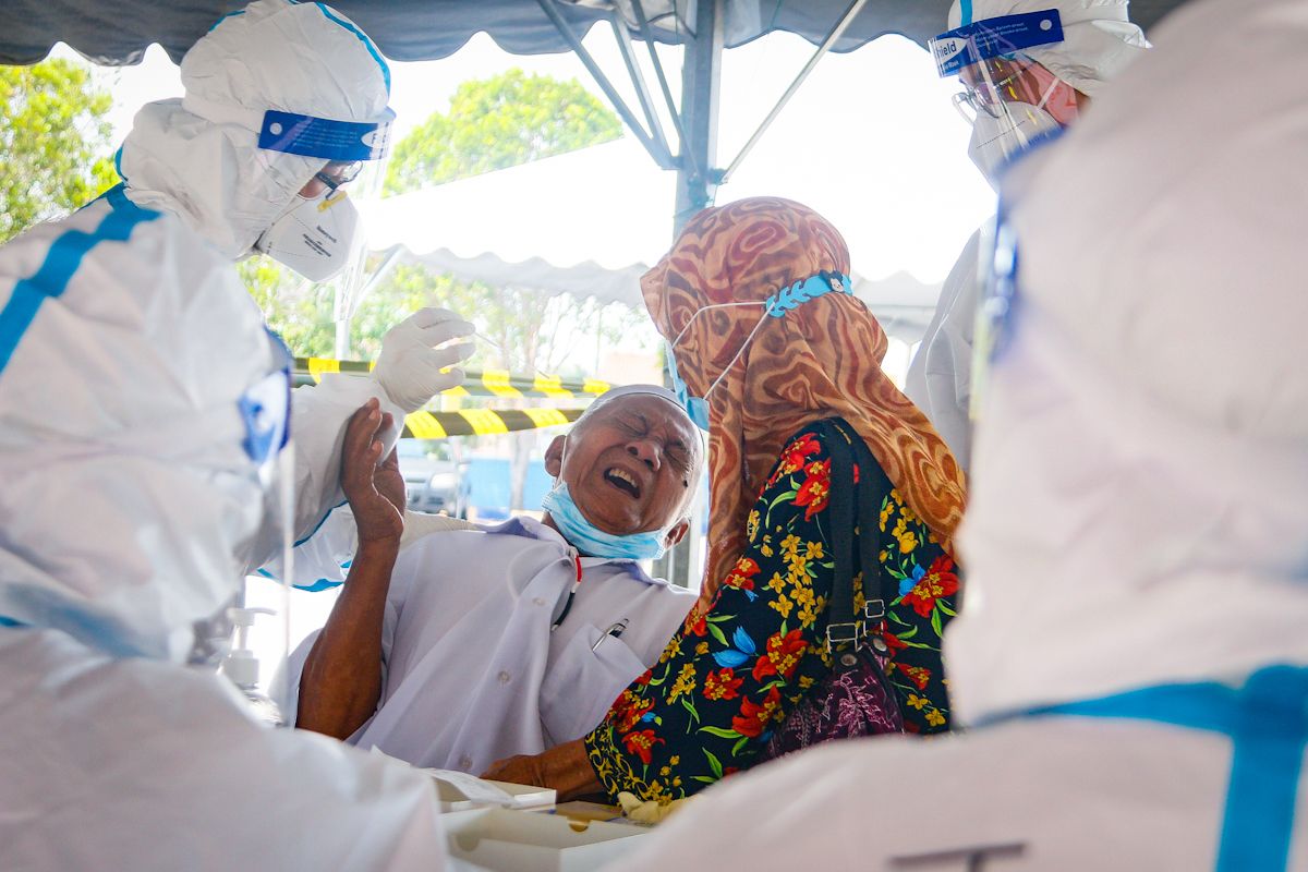 Zakaria Hashim, 75, yang pertama kali menjalani ujian calitan ditenangkan isteri Nor Salmah Yatimin, 67, pada program Saringan Komuniti Covid-19 bersasar secara percuma di Stadium Mini Sungai Besar, Sabak Bernam pada 25 Februari 2021.