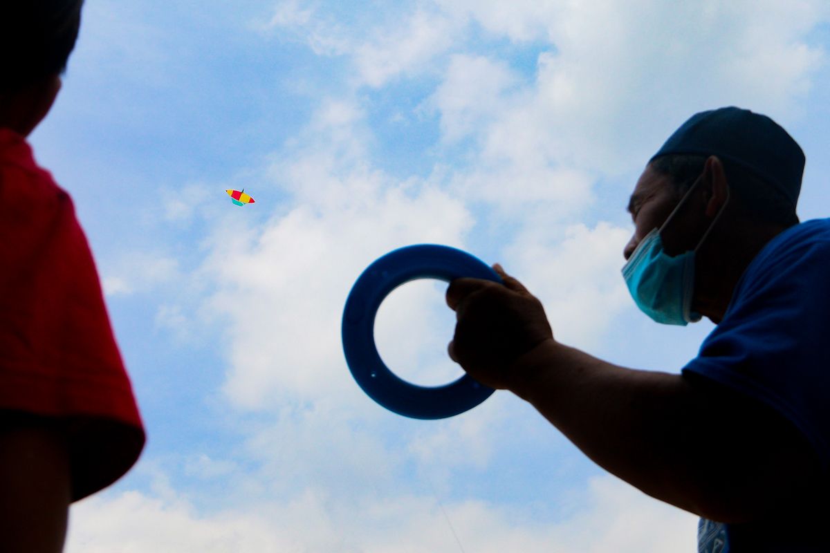 Pembuat wau kapal Selangor Muskhan Kastubi, 62, menerbangkan wau yang telah disiapkan di Kampung Sungai Buaya, Banting pada 19 Februari 2021 untuk menguji kualiti sebelum diserahkan kepada pelanggan.