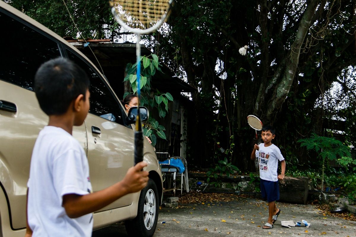 Pelajar Sekolah Kebangsaan Kajang Utama K Kugendran, 7, (kanan) mengisi masa lapang bermain badminton usai pembelajaran dalam talian bersama saudaranya N Nitesh, 7, di perkarangan rumahnya di Jalan Reko, Kajang pada 3 Februari 2021.