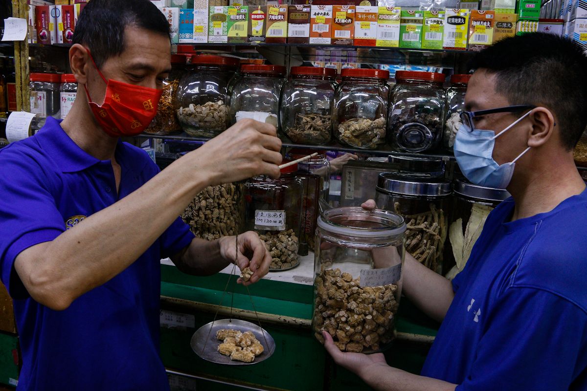 Pemilik pasar raya Weng Foon Sdn Bhd di Shah Alam Ng Ngunhin, 54, (kiri) dibantu anak saudara Ng Zheyi, 18, menimbang herba ginseng Amerika yang dijual di kedainya menggunakan alatan tradisional.