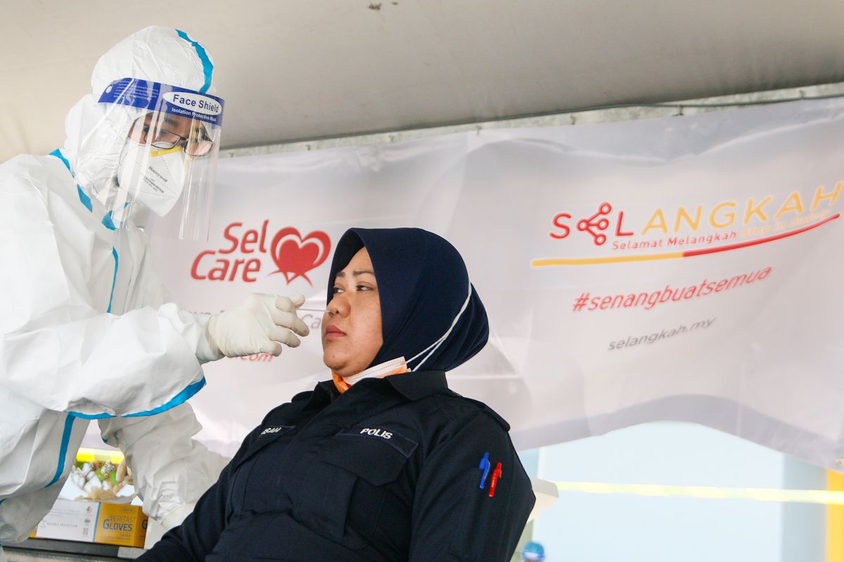Seorang anggota polis wanita kelihatan tenang semasa menjalani ujian calitan dalam Saringan Komuniti Covid-19 bersasar secara percuma di Stadium Mini Sungai Besar, Sabak Bernam pada 25 Februari 2021.