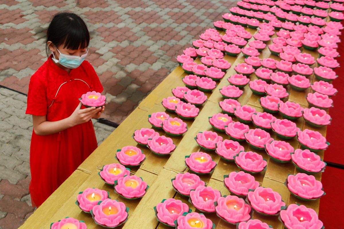 Keo Hui En, 11, berdoa sambil memegang lilin teratai di kuil Fo Guang Shan Dong Zen, Kuala Langat pada 12 Februari 2021.