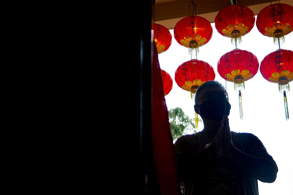 Seorang pengunjung berdoa sebelum memasuki ruang upacara sembahyang di Shah Alam Buddhist Society, Shah Alam pada 12 Februari 2021.
