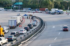 Sekatan jalan raya dilakukan oleh anggota polis dan tentera di laluan keluar masuk Plaza Tol Bukit Jelutong, Shah Alam pada 16 Januari 2021, hari keempat Perintah Kawalan Pergerakan.