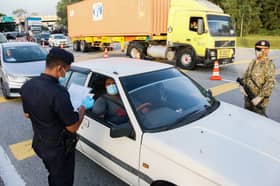 Anggota polis memeriksa dokumen merentas negeri daripada salah sebuah kenderaan ketika sekatan jalan raya diadakan di Plaza Tol Bukit Jelutong, Shah Alam pada 16 Januari 2021.