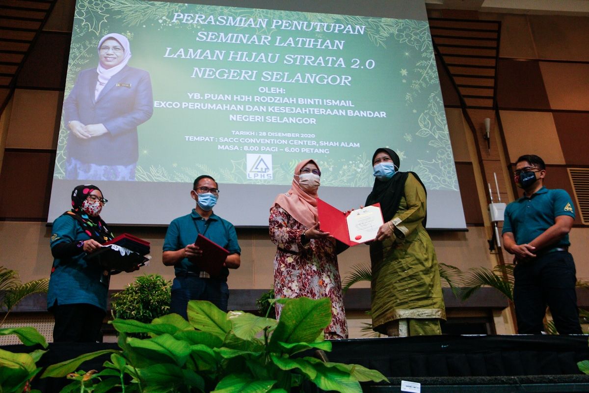EXCO Perumahan dan Kesejahteraan Bandar Rodziah Ismail menyerahkan sijil penghargaan kepada peserta selepas merasmikan penutupan seminar latihan laman hijau strata 2.0 di Pusat Konvensyen Shah Alam pada 28 Disember 2020.