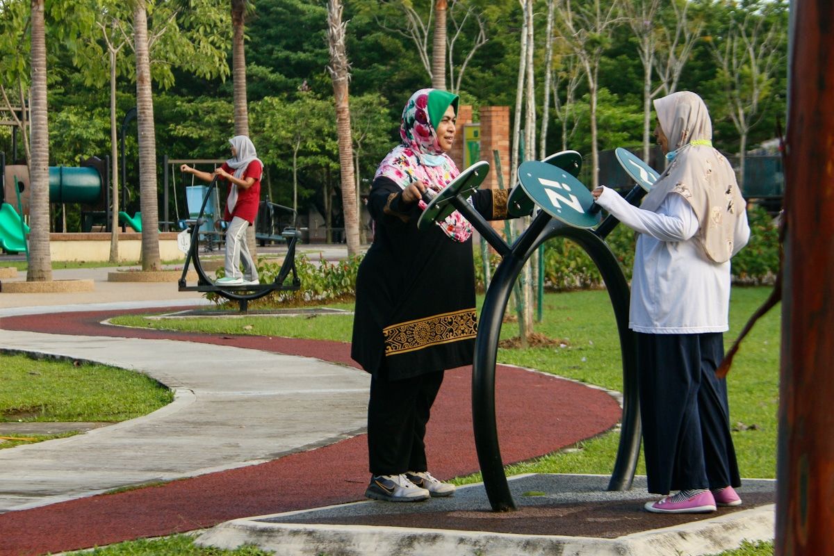 Kamsiah Basik, 59, bersama ibu Kamariah Karim, 75, (kanan) bersenam menggunakan kemudahan gimnasium yang disediakan di kawasan rekreasi Hutan Bandar USJ3, Subang Jaya pada 25 Disember 2020.