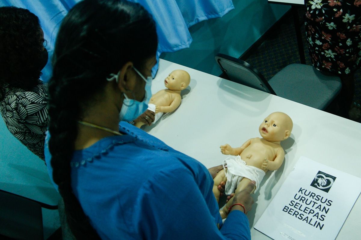 Peserta melakukan praktikal kaedah urutan bayi ketika mengikuti kursus perbidanan tradisional masyarakat India menerusi program Hijrah Zero to Hero di Bandar Puteri Puchong, Puchong pada 20 Disember 2020.
