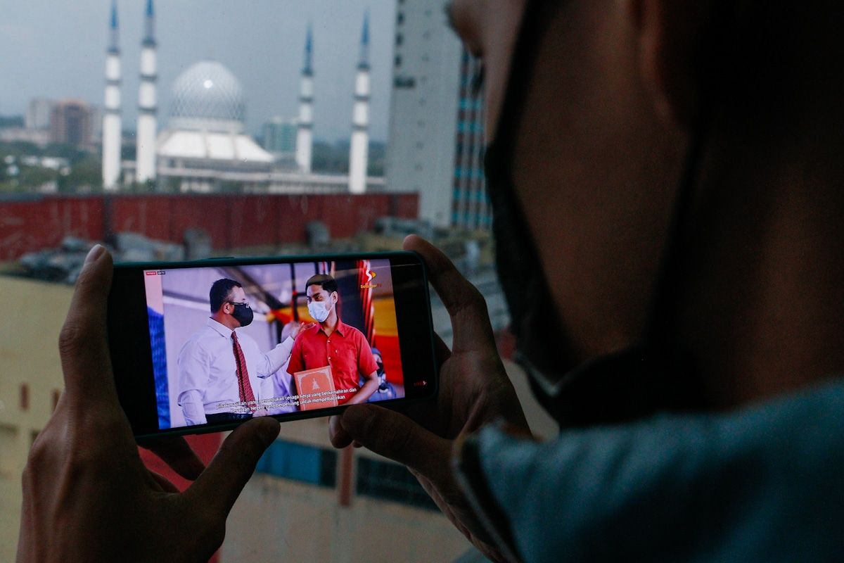 Seorang pengamal media mengikuti perasmian program Selangor Kerjaya disempurnakan Dato' Menteri Besar Dato' Seri Amirudin Shari menerusi Facebook Media Selangor di telefon pintar pada 26 Januari 2021.