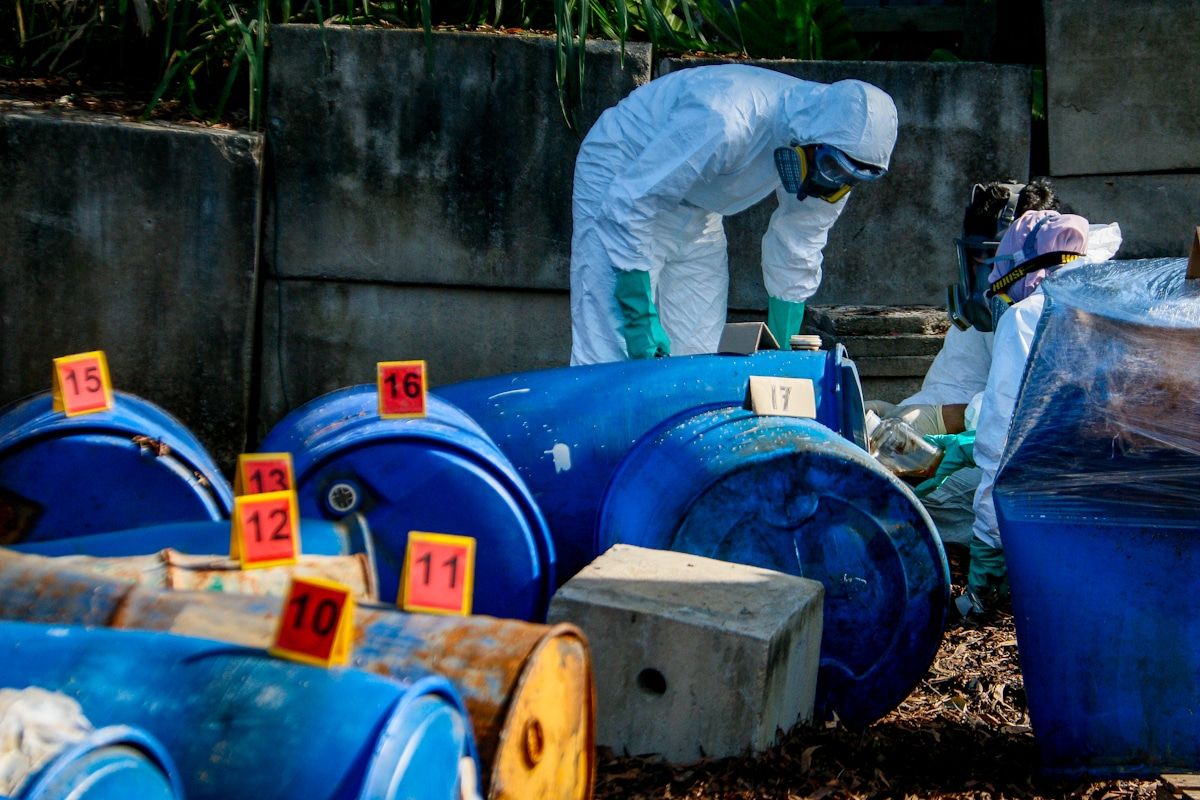 Petugas Jabatan Alam Sekitar mengambil sampel di kawasan pembuangan bahan kimia sekitar rizab Sungai Langat di Taman Seri Reko, Kajang pada 3 Februari 2021.