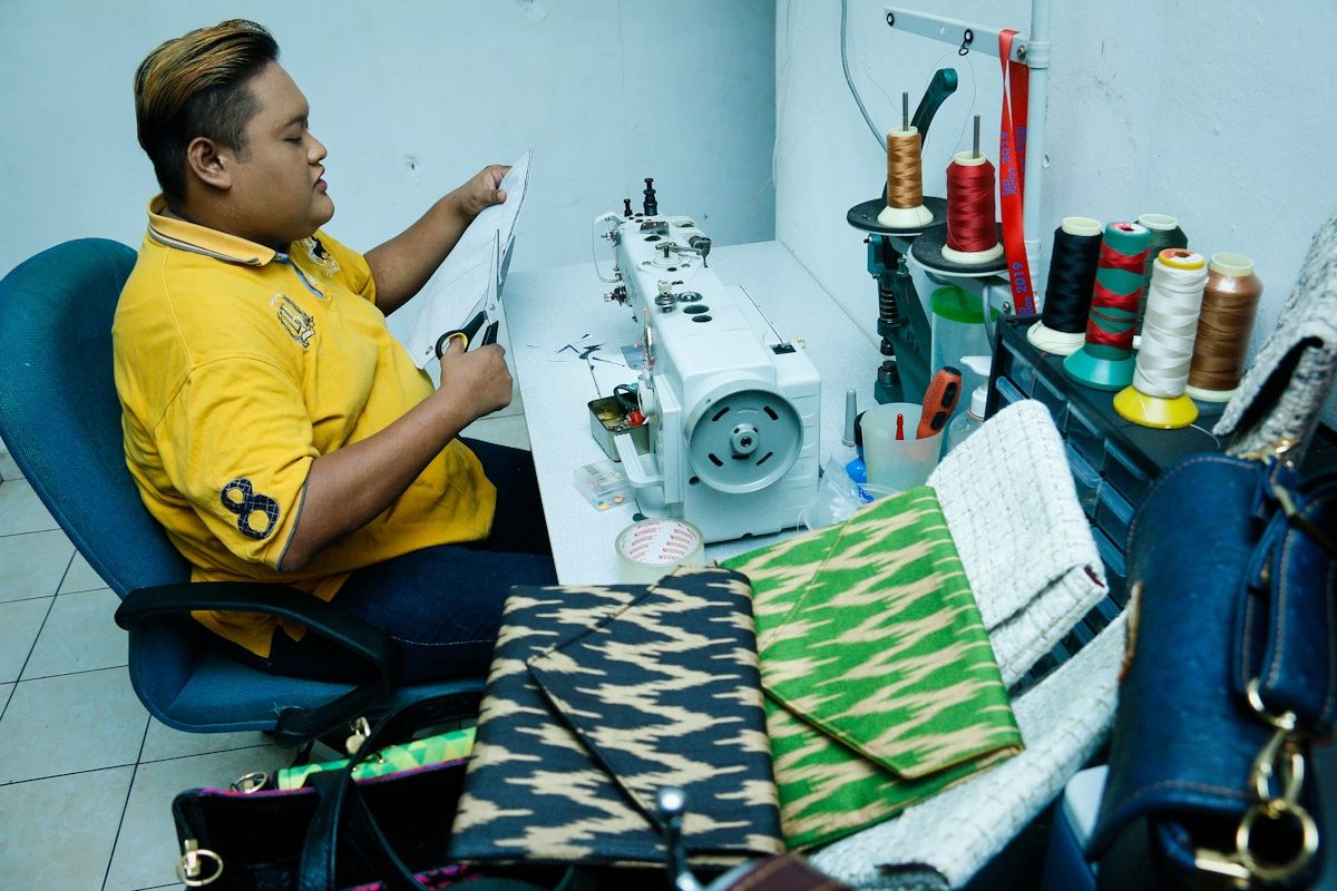 Fairuz Izzuddin, 33, melakukan proses kemasan jahitan beg kepit wanita (clutch bag) untuk dipasarkan sebagai salah satu produk Tanjung Suri di Jalan Kebun, Shah Alam pada 26 September 2020.