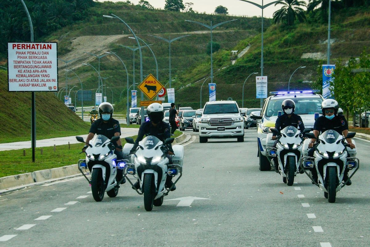 Penguat kuasa Majlis Bandaraya Shah Alam (MBSA) mengiringi kenderaan kakitangan Sime Derby Property yang memandu di Persiaran Shorea selepas perasmian persiaran itu di Seksyen U5, Shah Alam pada 28 September 2020.