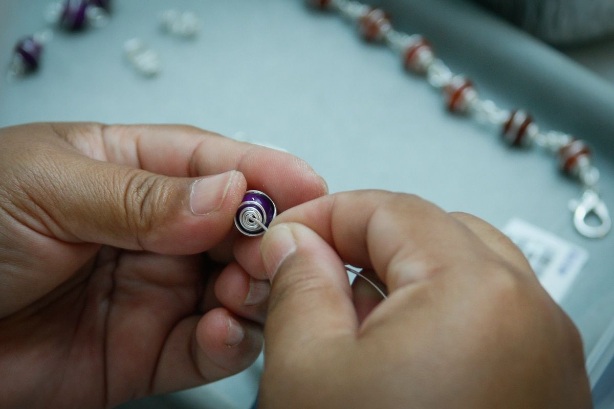 Usahawan Shafahira Hair Johari, 47, menggunakan teknik balutan besi halus pada butiran manik untuk menghasilkan perhiasan gelang tangan di Pusat Majlis Kebangsaan Pertubuhan Wanita Malaysia (NCWO), Petaling Jaya pada 27 September 2020.