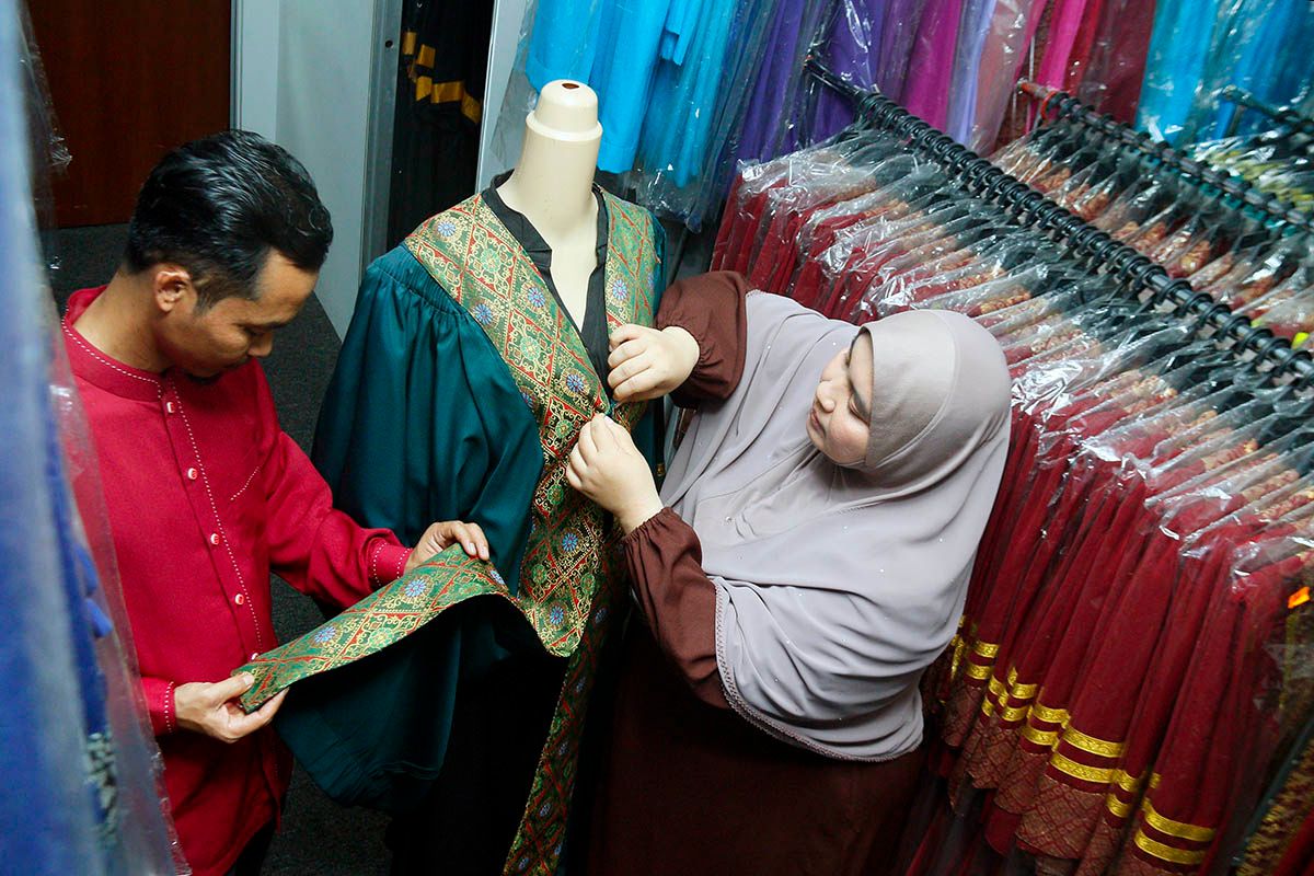 Usahawan Hijrah Mariam Hassan, 39, bersama suami Mohammad Syafiee Ambok Dalek, 37, meneliti kualiti jahitan jubah konvokesyen yang telah siap di Damansara Damai, Petaling Jaya pada 2 Oktober 2020.