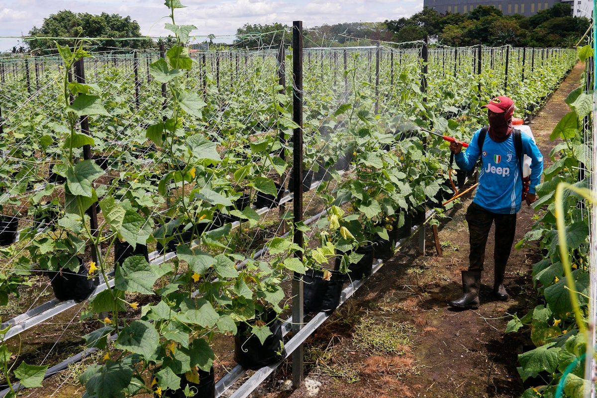 Pekerja Marget Rumansah, 19, menyembur baja cecair yang membantu tumbesaran tanaman timun di ladang yang diusahakan Bumi Suria Tech Sdn Bhd di Jalan Kebun, Shah Alam pada 8 Oktober 2020.