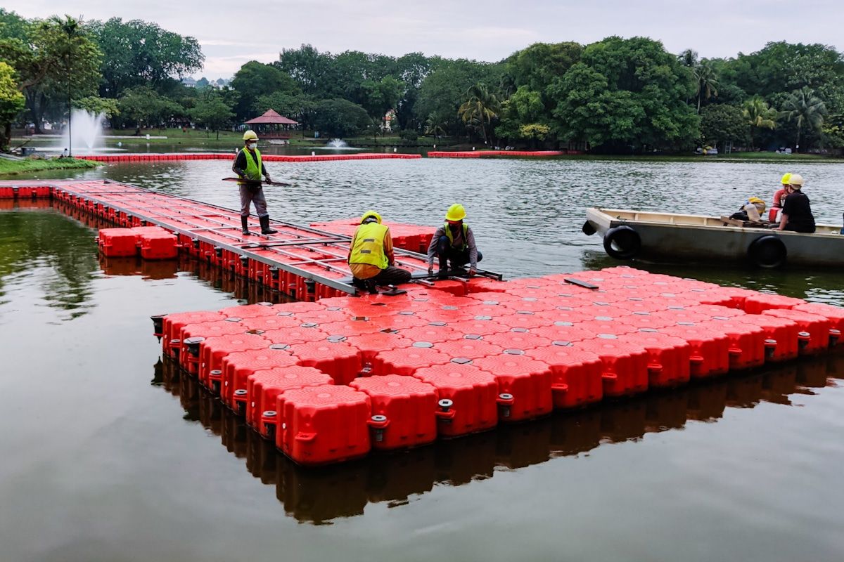 Beberapa pekerja binaan menyambungkan rangka besi di atas bahan plastik tahan lasak (jet float) bagi pembinaan jambatan terapung di Taman Tasik Shah Alam pada 7 Oktober 2020 yang bakal menjadi tarikan terbaharu kepada pengunjung dan dijangka siap pada November ini.
