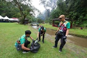 Sukarelawan, Mohamad Amri Abdullah , Mohamad Iman Irfan Iqbal Mubin dan Mohd Haiqal Akmal mengutip sampah ketika menyertai Program Kelestarian Alam Sekitar di Taman Eko Rimba Kanching, Rawang pada 15 September 2024.