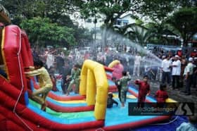 EXCO Belia, Sukan dan Keusahawanan Najwan Halimi (kanan) menyembur air kepada peserta Khatan Perdana pada Program Karnival Kesihatan DUN Kota Anggerik 2025 di Surau Al-Ansor, Seksyen 2, Shah Alam pada 02 Februari 2025.