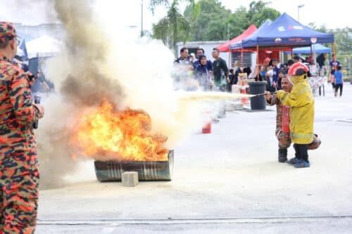 Kanak kanak mengikuti demo memadam kebakaran dari Bomba Sukarelawan Saujana Utama ketika Program Hillpark Comunity Fun Run 2024 di Surau Al Mauizhah Bandar Hillpark, Puncak Alam pada 29 September 2024.