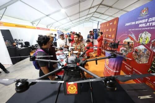 Pegawai Bomba Ahmad Zaidi Abdul halim memberi penerangan mengenai drone PGI Matrice 600 Pro yang digunakan untuk pemantauan udara mencari dan menyelamat di reruai jabatan Bomba dan Penyelamat ketika Pameran Udara Selangor (SAS) 2024 di Pusat Penerbangan Serantau (RAC) Skypark, Shah Alam pada 13 Septembar 2024.