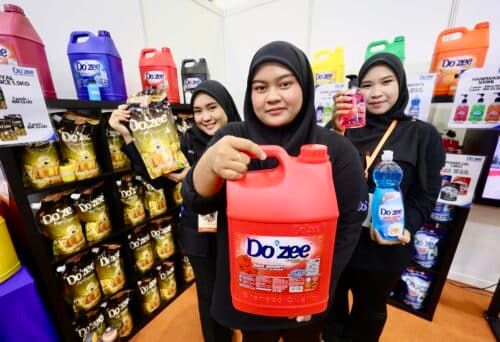 Dari kiri, Nazhariliya Shuhada Ahmad Suhaimi, Qatira Qirranie Ahmad Zaihom dan Nazatul Natasha Abdul Razak menunjukkan produk sabun Do’zee keluaran bumiputra ketika Ekspo Usahawan Selangor SELBIZ 2024 di Setia City Convention Centre pada 4 Oktober 2024. Foto NUR ADIBAH AHMAD...