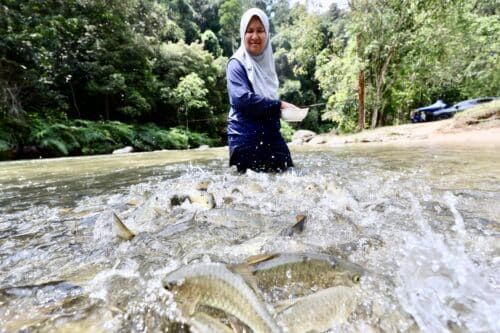 Pengunjung, Nusrah Alifah Ahmad memberi makan Ikan Kelah di Santuari Ikan Sungai Chiling Kuala Kubu Baru pada 8 Oktober 2024.
