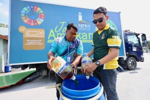 Kakitangan MPKS, Hambali Mohd Rasat dan Fahmi Shamshudin menuang minyak masak terpakai yang dikumpul kariah Masjid Nurul Iman Kampung Ijok ketika lawatan kutipan berkala Majlis Perbandaran Kuala Selangor ke masjid berkenaan.
