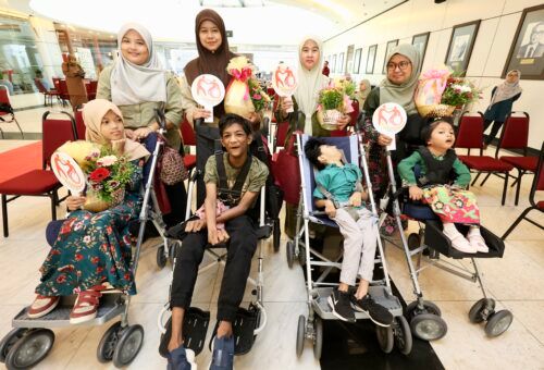 Kanak-kanak penghidap celebral palsy (dari kiri) Wan Puteri Nor Atiqah Wan Emey Sharil,12, abdullah Harith Mohd Safazulhilmi, 19, Muhammad Irfan Kamal Zamri,10 dan Nur Aira Izdihar Abdullah,5 ketika hadir pada majlis perasmian Celebral Palsy Care Unit (CPCU) 2024 di Bangunan SSAAS, Shah Alam pada 12 Julai 2024.