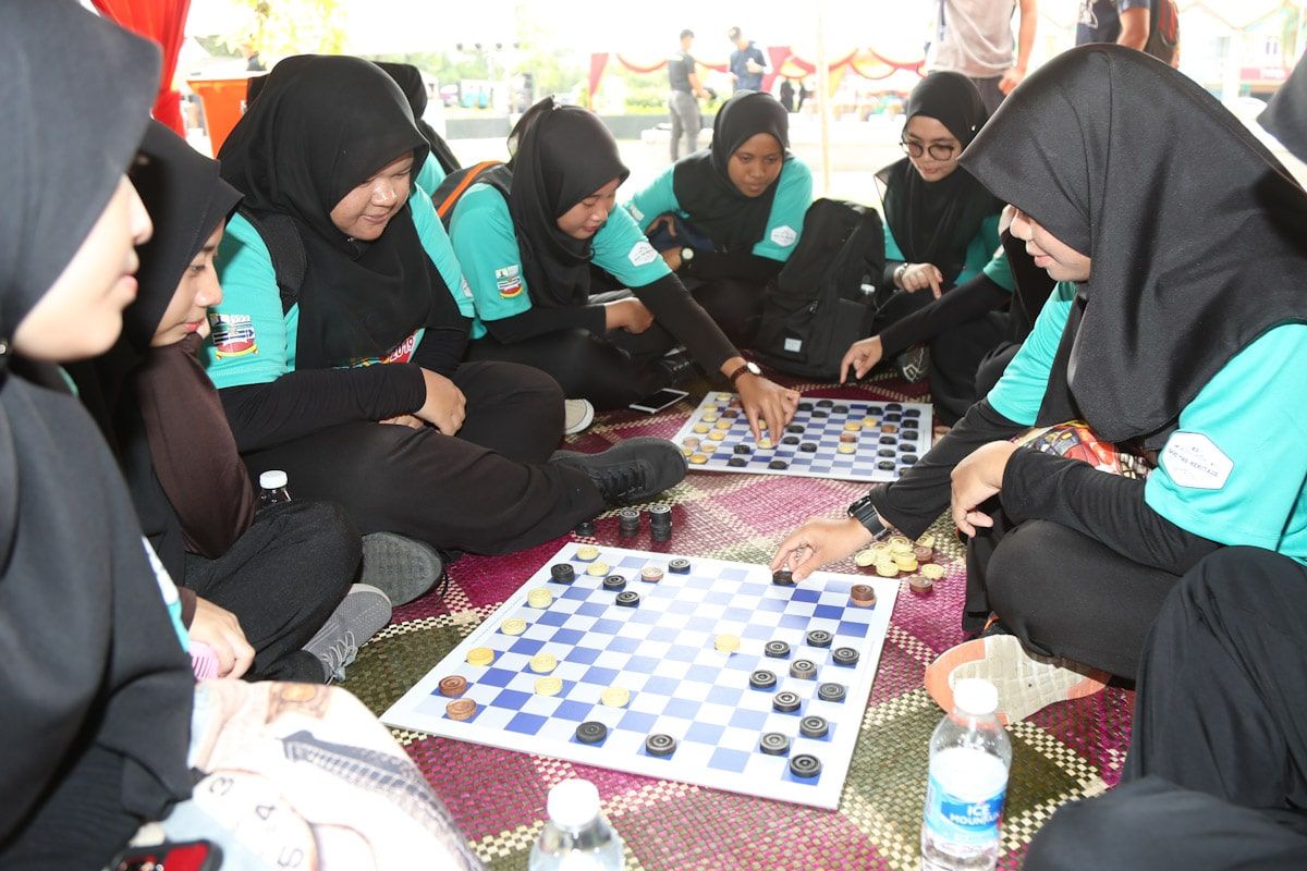 Peserta bermain permainan Tradisional Dam Aji di galeri Warisan pada Majlis Perasmian Karnival Kuala Selangor Tahun 2019 MDKS di Dataran Melawati, Kuala Selangor.19 Oktober 2019.