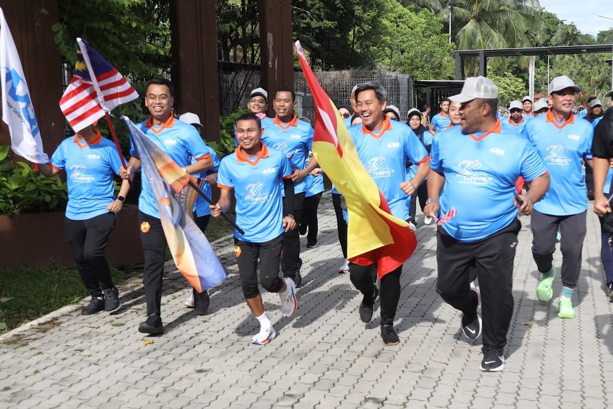 Ketua Pegawai Eksekutif Menteri Besar Selangor (Pemerbadanan) atau MBI Saipolyazan M Yusop (dua, kiri), Pengarah Urusan KDEB Waste Management (KDEBWM) Dato’ Ramli Mohd Tahir (kanan) dan Ketua Pegawai Eksekutif Selangor FC Dr Johan Kamal Hamidon (dua, kanan) serta Pemain Selangor FC Faisal Halim (tengah) menyertai program Larian Jiwa Merdeka anjuran MBI di Tasik Shah Alam pada 28 Ogos 2024.