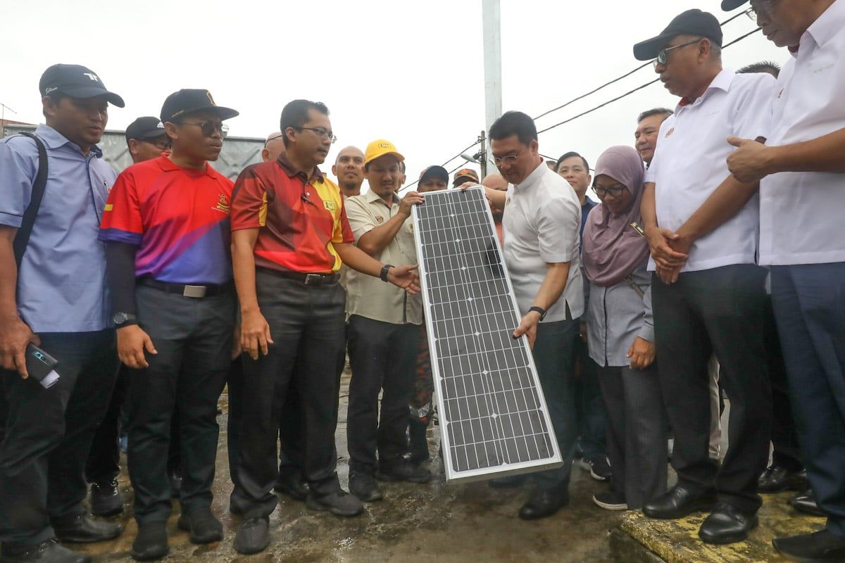 Menteri Pembangunan Kerajaan Tempatan Nga Kor Ming (empat,kanan) mendengar penerangan dari Jurutera Eletrik Penguasa JKR Malaysia Ir Dr Abdul Muhaimin Mahmud (empat,kiri) ketika pelancaran projek pemasangan lampu jalan jenis solar led sempena program lawatan kerja Kementerian Pembangunan Kerajaan Tempatan (KPKT) ke Selangor di Pulau Ketam, Pelabuhan Klang, Klang pada 14 Julai 2023.