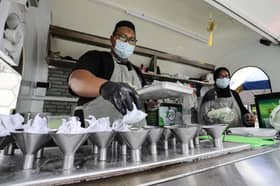 Peniaga, Izat Abdul Razak, 44, bersama isterinya, Ira Azira Mat Noor, 42, memakai pelitup muka serta mengikut SOP ketika menyediakan putu piring di Taman Sri Gombak, Batu Caves semasa tinjauan SelangorKini berikutan Perintah Kawalan Pergerakan Bersyarat pada 18 Oktober 2020.