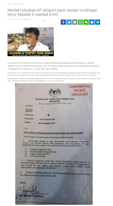 நேரடி பேச்சு வார்த்தை வழி அந்த 4 நிறுவனங்களுக்கும் மணல் ஏற்றுமதி அனுமதி வழங்கப்பட்டதாக கூறுவது தவறாகும். ஏனெனில், அந்த நிறுவனங்களின் விண்ணப்பங்களை மாநில அரசு அங்கீகரித்த பின்னரே அமைச்சு அனுமதி அளித்தது.