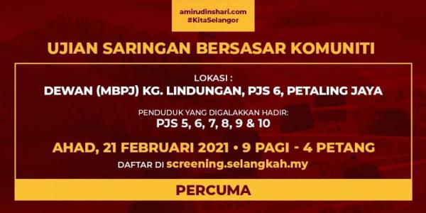 ஷா ஆலம், பிப் 20- சிலாங்கூர் அரசின் இலவச கோவிட்-19 பரிசோதனை இயக்கம் நாளை ஞாயிற்றுக்கிழமை பெட்டாலிங் ஜெயா, பிஜேஎஸ் 6, கம்போங் லிண்டோங்கான் எம்.பி.பி.ஜே. மண்டபத்தில் நடைபெறும்.