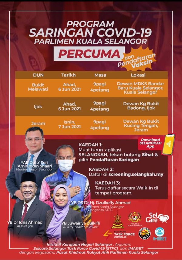 மேற்படி இடங்களில் நடைபெறும் பரிசோதனைகளில் தவறாது கலந்துக் கொள்ளும்படி கோல சிலாங்கூர் நாடாளுமன்ற உறுப்பினர் டத்தோஸ்ரீ டாக்டர் ஜூல்கிப்ளி அகமது, புக்கிட் மெலாவத்தி சட்டமன்ற உறுப்பினர் ஜூவாரியா சூல்கிப்ளி மற்றும் ஈஜோக் சட்டமன்ற உறுப்பினர் டாக்டர் இட்ரிஸ் அமாட் கூட்டாக விடுத்த அறிக்கையின் வழி கேட்டுக் கொண்டனர்.
