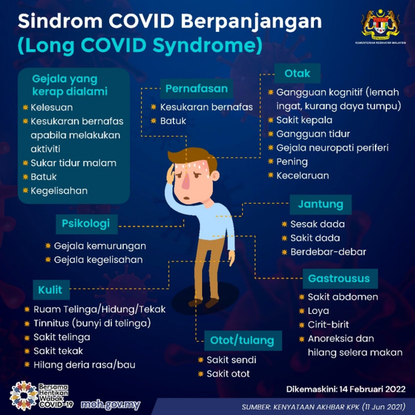 ஷா ஆலம்,பிப் 15: கோவிட்-19 நோய்தொற்றால் பாதிக்கப்பட்டு குணமடைந்த பிறகும் 12 வாரங்கள் அல்லது அதற்கும் மேலாக அறிகுறிகள் இருக்க வாய்ப்பிருக்கிறது. உடலில் உள்ள பல்வேறு உறுப்புகளின் செயல்பாட்டில் கோவிட் -19 நோய்த்தொற்றின் சிக்கல்கள் காரணமாக இந்த நிலை ஏற்பட்டதாக மலேசிய சுகாதார அமைச்சகம் (MOH) தெரிவித்துள்ளது.