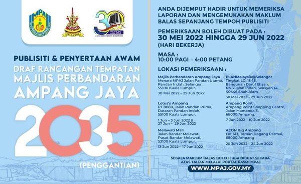 ஷா ஆலம், மே 30: 2035 உள்ளூர் திட்ட வரைவை தயாரிப்பதில் பொதுமக்களின் பங்களிப்பை ஊக்குவிக்கும் வகையில் அம்பாங் ஜெயா முனிசிபல் கவுன்சில் (எம்பிஏஜே) ஒரு கண்காட்சிக்கு ஏற்பாடு செய்துள்ளது.