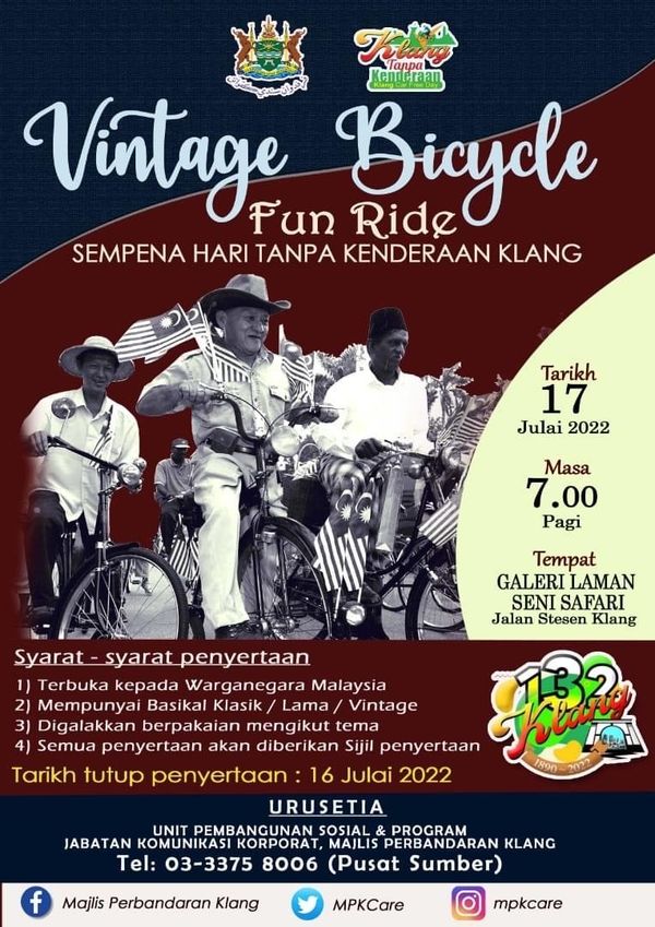 ஷா ஆலம், ஜூலை 14- கிள்ளான் நகராண்மைக் கழகத்தின் ஏற்பாட்டில் வரும் ஞாயிற்றுக் கிழமை நடைபெறவுள்ள ‘விண்டேஜ் சைக்கிள் ஃபன் ரைட்‘ போட்டியில் பங்கேற்க பழைய சைக்கிள் வைத்திருக்கும் பொது மக்கள் அழைக்கப்படுகிறார்கள்.