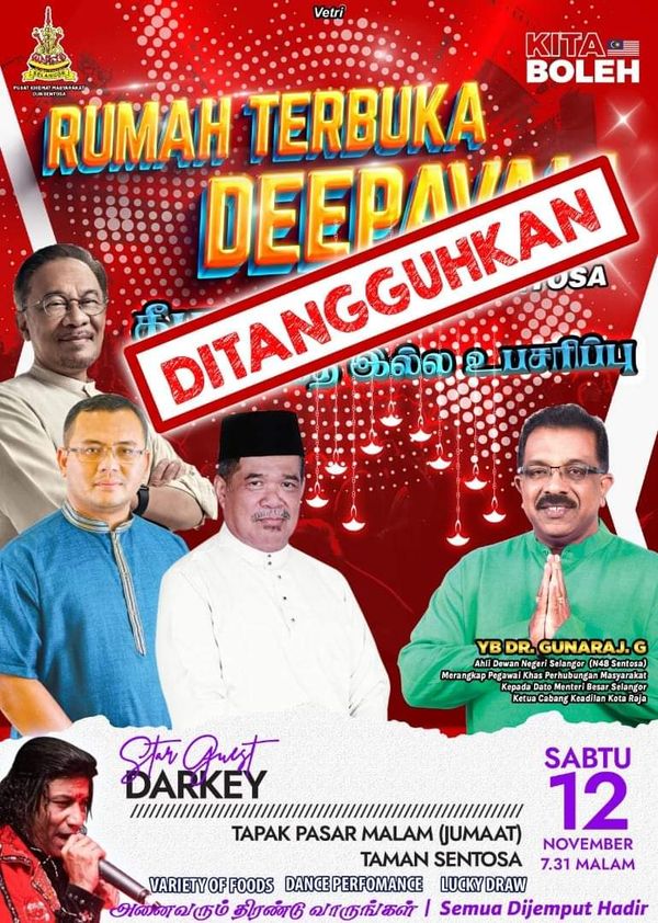 கிள்ளான், நவ 11 - நவம்பர் 12ஆம் தேதி, சனிக்கிழமை நாளை நடைபெறவிருந்த செந்தோசா சட்டமன்றத் தீபாவளி திறந்த இல்ல உபசரிப்பு, ஒத்திவைக்கப்பட்டுள்ளது. தீபாவளி கொண்டாட்டத்திற்கான புதிய தேதியை செந்தோசா சட்டமன்ற சேவை மையம் விரைவில் அறிவிக்கும்.