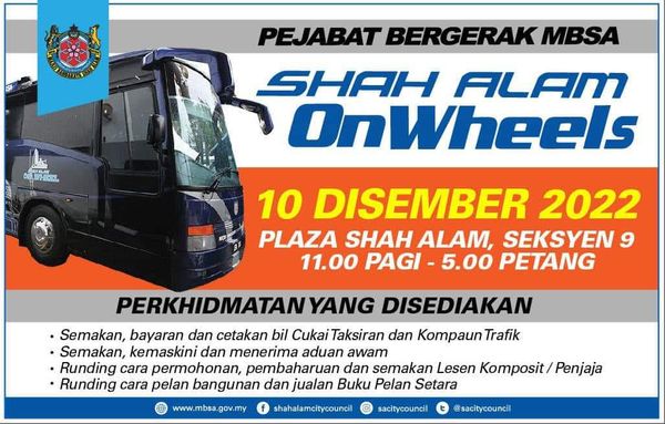 ஷா ஆலம், டிச 9- ஷா ஆலம் மாநகர் மன்றத்தின் (எம்.பி.எஸ்.ஏ.) ஏற்பாட்டிலான நடமாடும் முகப்பு சேவை இங்குள்ள செக்சன் 9, பிளாசா ஷா ஆலமில் நாளை 10ஆம் தேதி சனிக்கிழமை நடைபெற உள்ளது.‘ஷா ஆலம் ஒன் வீல்ஸ்‘ எனப்படும் இந்த சேவை காலை 11.00 மணி முதல் மாலை 5.00 மணி வரை நடைபெறும் என்று மாநகர் மன்றத்தின் வர்த்தக மற்றும் பொது உறவுப் பிரிவின் தலைவர் ஷாரின் அகமது கூறினார்.