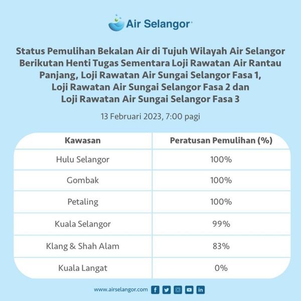 ஆயர் சிலாங்கூர் (Air Selangor) நிர்வாகம் உலு சிலாங்கூர், கோம்பாக் மற்றும் பெட்டாலிங் ஆகிய பகுதிகள் முழுமையாக மீண்டு விட்ட நிலையில் கோலா சிலாங்கூர் 99 சதவிகிதம், கிள்ளான் மற்றும் ஷா ஆலம் (83 சதவிகிதம்) மற்றும் கோலா லங்காட் (இன்னும் மீளவில்லை) என்றும் தெரிவித்தது.