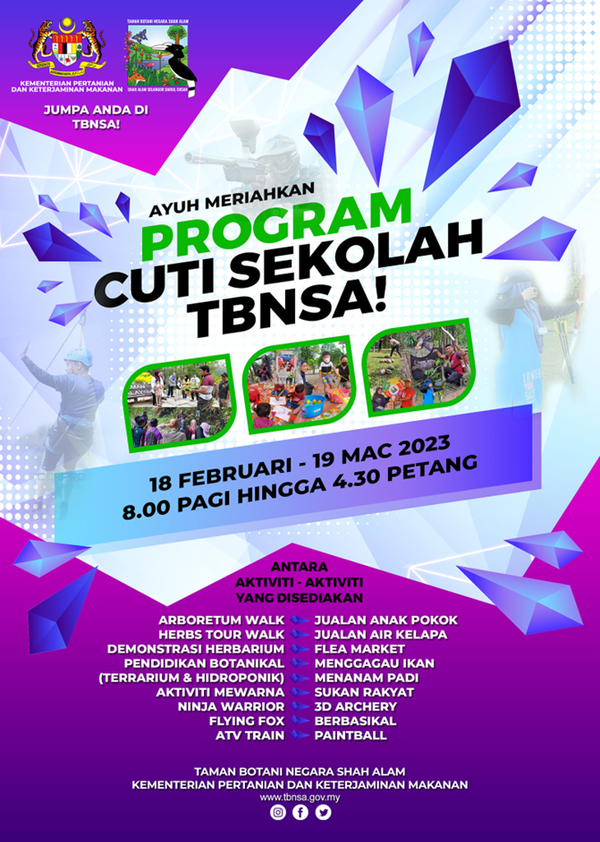 ஷா ஆலம், பிப் 13: ஷா ஆலம் தேசியத் தாவரவியல் பூங்கா (டிபிஎன்எஸ்ஏ) பள்ளி விடுமுறை காலம் முழுவதும் பல்வேறு சுவாரஸ்யமான நடவடிக்கைகள் மற்றும் விற்பனைகளை ஏற்பாடு செய்து வருகிறது.