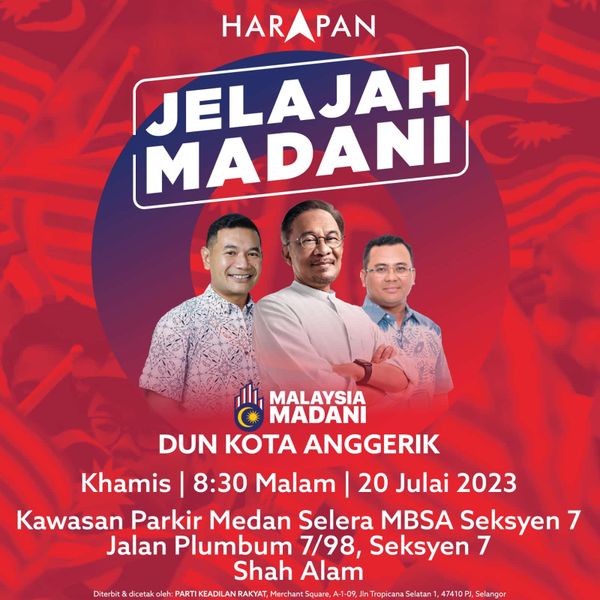 இரவு 8.30 மணி அளவில் நடைபெறும் இந்நிகழ்வில் பிரதமர் டத்தோஶ்ரீ அன்வார் இப்ராஹிம் மற்றும் டத்தோ மந்திரி புசார் டத்தோஶ்ரீ அமிருடின் ஷாரி ஆகியோரும் கலந்து கொண்டு சிறப்பிப்பார்கள். கோத்தா அங்காரிக் தொகுதி ஏற்பாட்டிலான இந்நிகழ்வுக்கு பொதுமக்கள் திரண்டு வந்து ஆதரவு வழங்க வேண்டி ஏற்பாட்டுக் குழுவினர் கேட்டுக் கொள்கிறார்கள்.