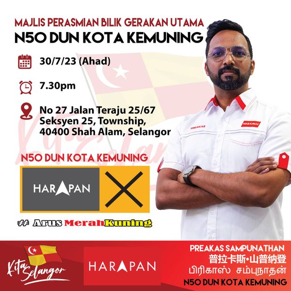 ஷா ஆலம், ஜூலை 30- கோத்தா கெமுனிங் தொகுதியின் பக்கத்தான் ஹராப்பான் தேர்தல் இயந்திரம் மற்றும் நடவடிக்கை அறையின் திறப்பு விழா இன்று ஜூலை 30ஆம் தேதி இரவு 7.30 மணிக்கு இங்குள்ள தாமான் ஸ்ரீமூடா ஜாலான் தெராஜூ 25/67 எனும் முகவரியில் நடைபெறவுள்ளது.