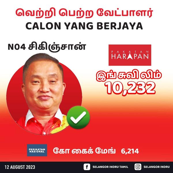 பக்காத்தான் ஹராப்பான் சிகிஞ்சான், ஶ்ரீ கெம்பாங்கான், கின்றாரா, சுபாங் ஜெயா, பந்திங் ஆகிய தொகுதிகளில் வெற்றி பெற்றுள்ள நிலையில் சுங்கை பூரோங் தொகுதில் பெரிக்காத்தான் நேஷனல் வெற்றி கண்டுள்ளது.