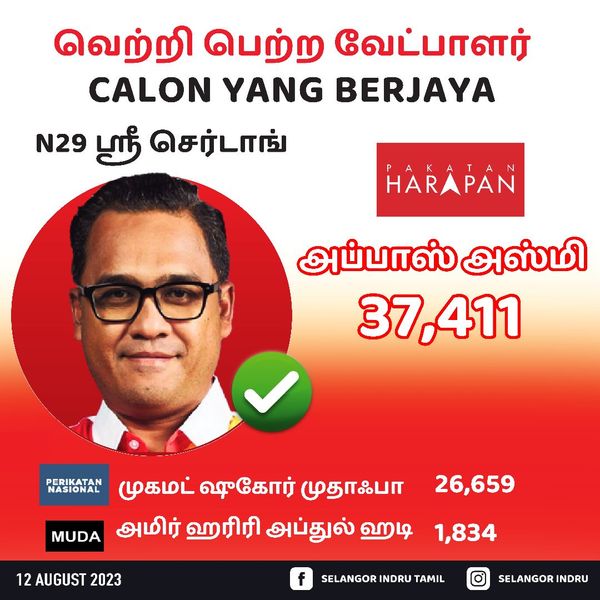 பக்காத்தான் ஹராப்பான் மேரு, ஶ்ரீ செர்டாங், தாமான் டெம்ப்ளர், பண்டான் இண்டா ஆகிய தொகுதிகளில் வெற்றி பெற்றுள்ள நிலையில் கோம்பாக் செத்தியா மற்றும் உலு பெர்ணம் தொகுதிகளில் பெரிக்காத்தான் நேஷனல் வெற்றி கண்டுள்ளது.